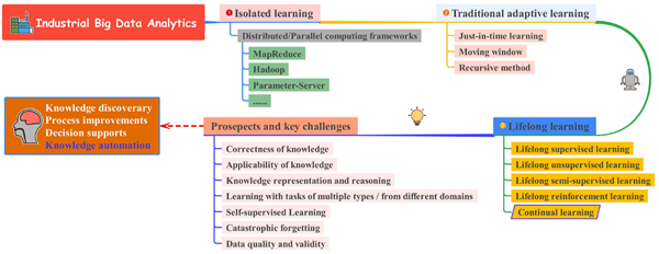 智能制造和工业互联网时代的到来带来了越来越多的机遇以及对现代工业的挑战。具体来说,得益于数字、网络、智能和工业自动化等领域的技术,传统制造业的生产模式正在发生变革。工业大数据分析作为连接智能制造与工业互联网平台的核心环节,越来越受到学术界和产业界的重视。高效挖掘工业大数据所蕴涵的高价值信息,以及利用真实的工业过程是目前最热门的话题之一。同时,随着工业自动化向知识自动化的深入发展,工业大数据分析的学习范式也在相应地发展。因此,本文从工业大数据分析的视角出发,针对相应的工业场景,积极探索工业大数据背景下学习范式的变革: a) 分析工业大数据分析范式的演变,即从孤立学习到终身学习,并进一步总结两者之间的关系; b) 列出了终身学习的主流方向,并详细讨论了其在工业场景中的应用; c) 展望未来发展方向。