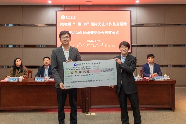 仪式上,香港亚非集团与我校签订了《捐赠协议书》。李庆峰代表学校接受了100万元陆增祺“一带一路”国际交流合作基金捐赠,并为香港亚非集团颁发捐赠证书。学生处相关负责人宣读了2023年陆增镛奖学金获奖学生名单,尹湘华为获奖学生代表颁发奖学金证书。