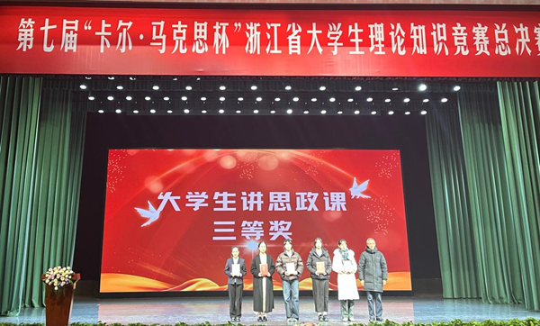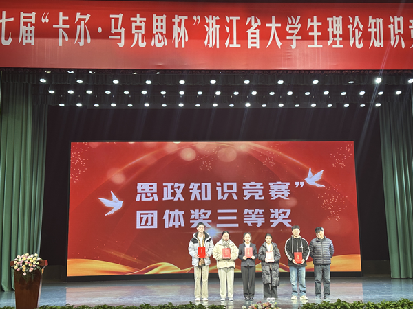 近日,第七届“卡尔·马克思杯”浙江省大学生理论知识竞赛决赛在浙江工商大学举行。我校研究生选手首次参赛便脱颖而出,荣获“大学生讲思政课”省三等奖、“思政知识竞赛”团体赛省三等奖的成绩。其中,姜瑶同学以其扎实的理论基础,荣获了“思政知识竞赛”个人赛省二等奖,胡丹丹、杨敏、周静、边鸿蕾、马依菲、沈聪、黄婷婷荣获个人赛省三等奖。