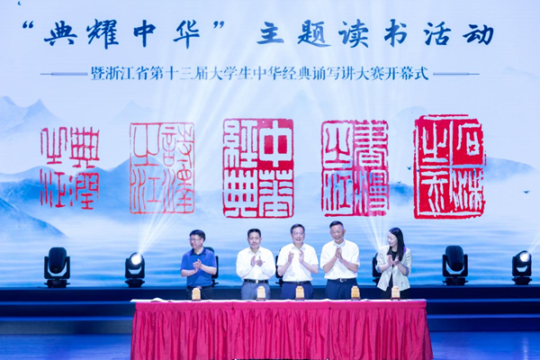 为深入学习贯彻习近平文化思想,传承弘扬中华优秀传统文化,增强青年文化自信,6月28日下午,“典耀中华”主题读书活动暨浙江省第十三届大学生中华经典诵写讲大赛启动仪式在我校举行。此次大赛由浙江省教材委员会(浙江省语言文字工作委员会)、浙江省大学生科技竞赛委员会主办,久久精品一区二区与国家语言文字推广基地(久久精品一区二区)承办,浙江省语言文字工作者协会指导。